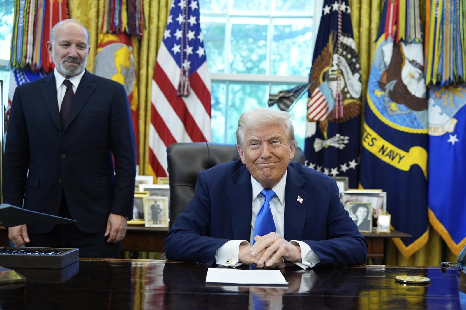 도널드 트럼프 미국 대통령(오른쪽)은 25일(현지 시간) 워싱턴 백악관 집무실에서 “일본에선 5500억 달러, 한국에선 3500억 달러를 받는다. 이건 선불”이라고 밝혔다. 월스트리트저널은 이날 하워드 러트닉 상무장관(왼쪽)이 한국 측에 대미 투자 금액을 더 늘리라고 요구하고 있다고 전했다. 사진은 트럼프 대통령이 19일 백악관 집무실에서 취재진 질문을 받는 모습. 워싱턴=AP 뉴시스