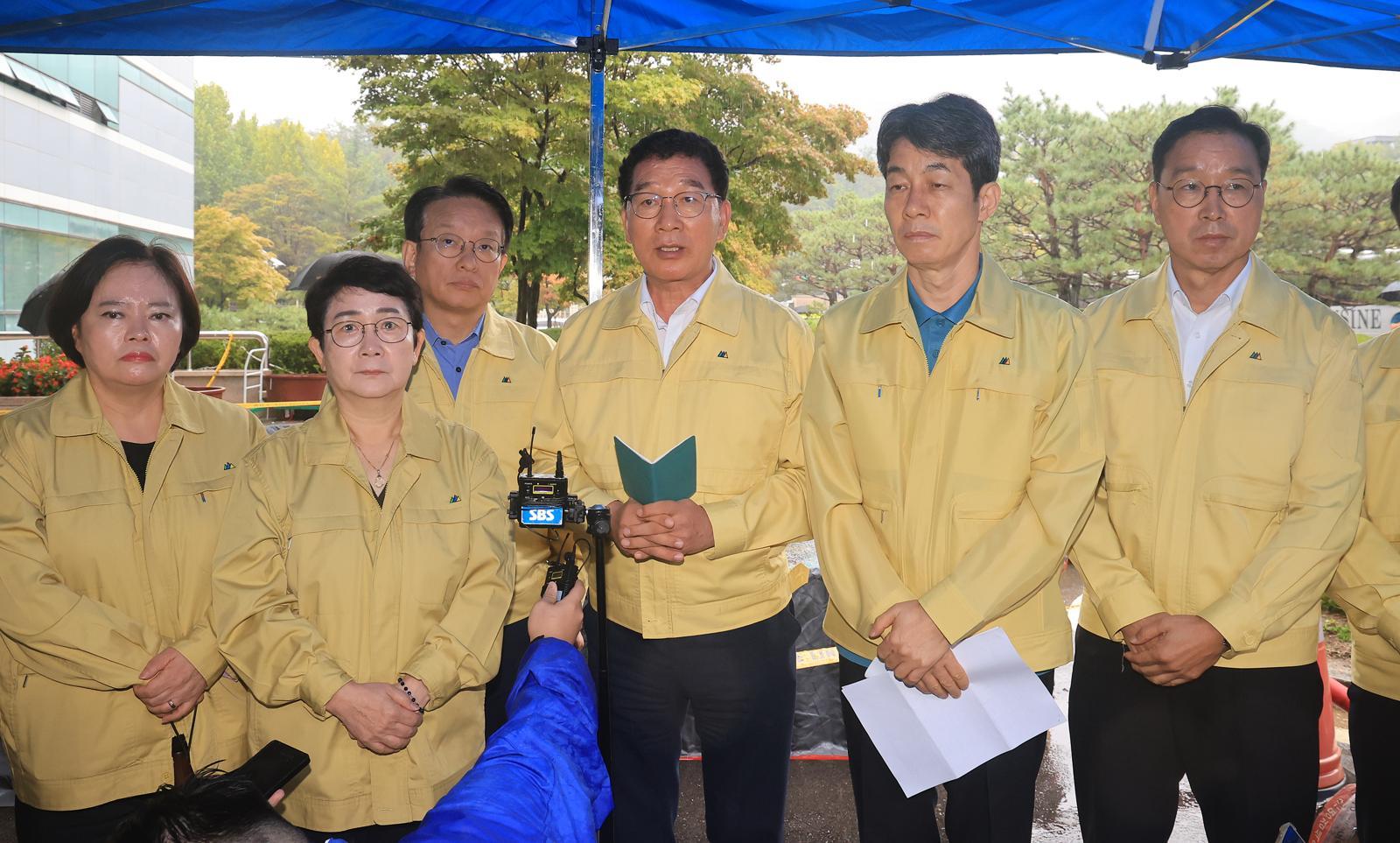 국회 행정안전위원장인 신정훈 더불어민주당 의원을 비롯한 행안위 위원들이 28일 오전 대전 유성구 국가정보자원관리원 화재 현장을 방문해 피해 상황 등을 살핀 뒤 발언하고 있다. 2025.9.28/뉴스1