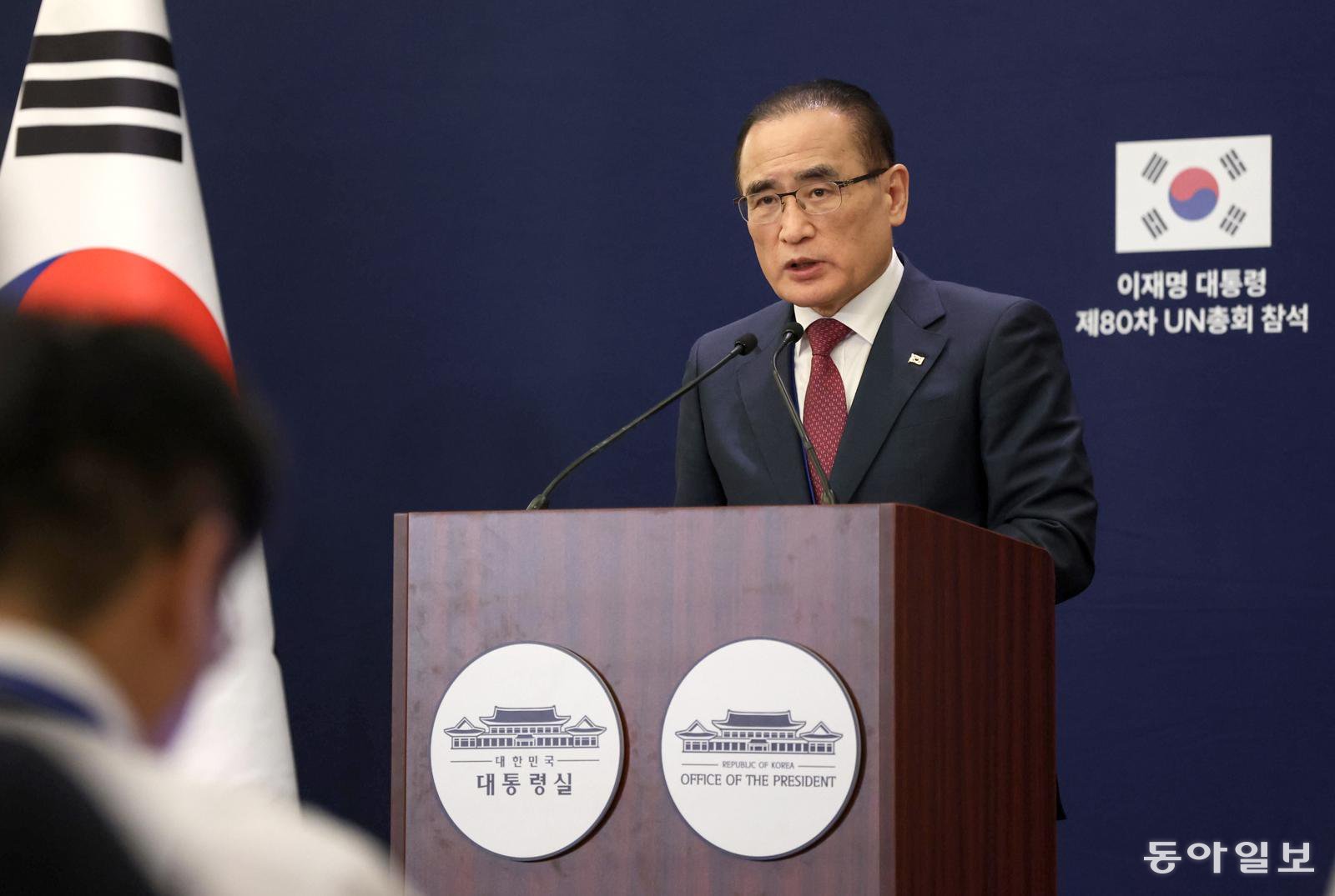 위성락 국가안보실장이 23일(현지시간) 미국 뉴욕 한 호텔의 한국프레스센터에서 이재명 대통령의 유엔 총회 기조연설, 정상회담 관련 브리핑을 하고 있다. 송은석 기자 silverstone@donga.com
