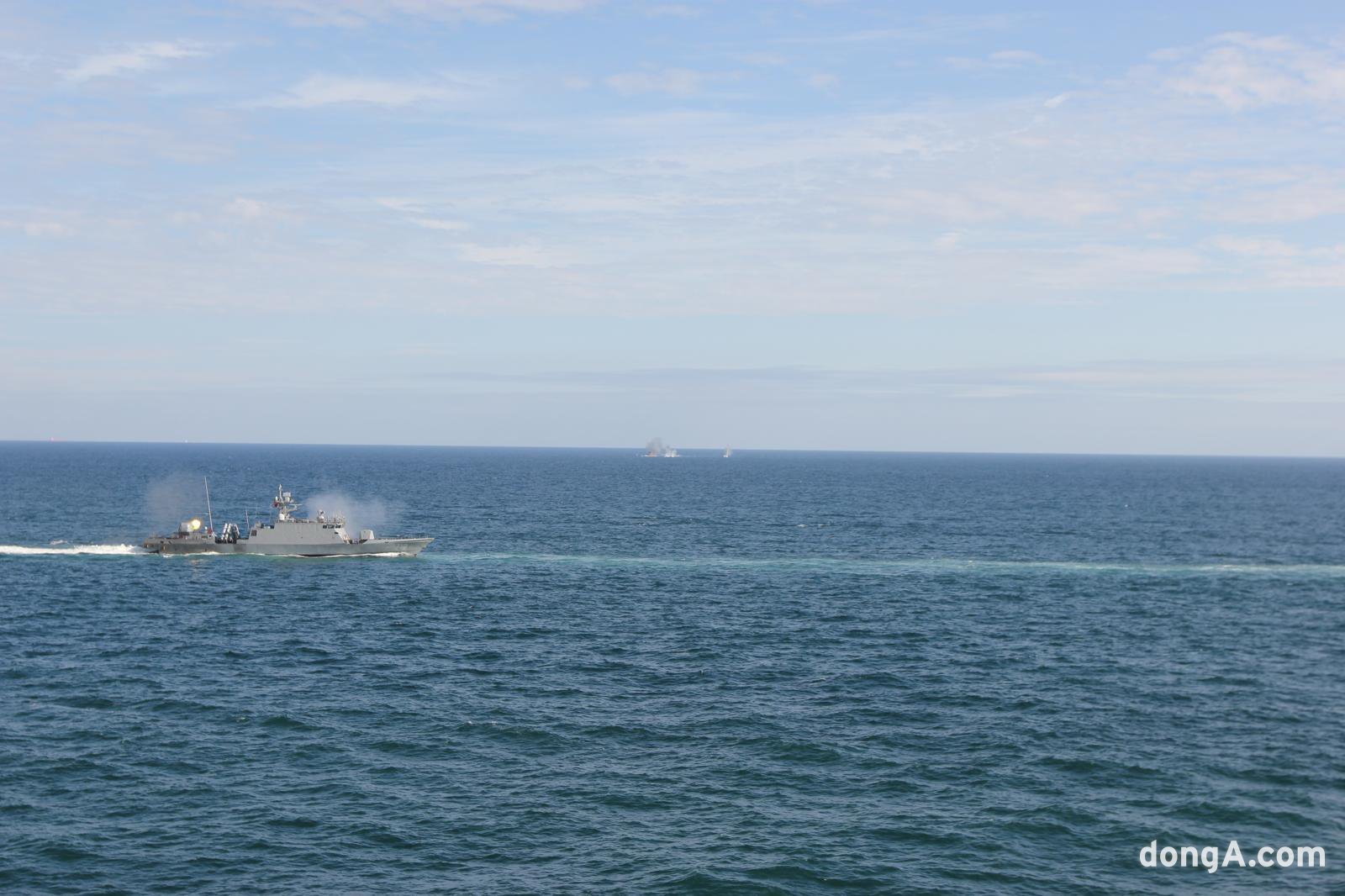 부유 목표물을 향해 76mm와 40mm 함포사격을 가하는 한상국함. 최재호 기자 cjh1225@donga.com