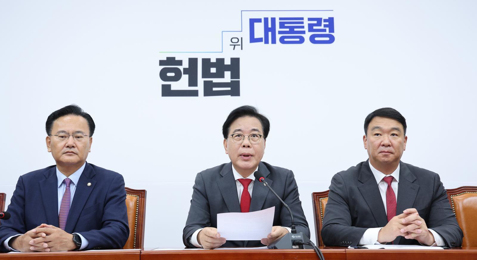 국민의힘 송언석 원내대표가 30일 서울 여의도 국회에서 30일 서울 여의도 국회에서 열린 원내대책회의에서 발언하고 있다. 왼쪽부터 유상범 원내운영수석부대표, 송 원내대표, 정희용 사무총장. 뉴스1