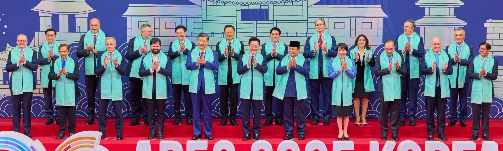이재명 대통령이 1일 경북 경주 화백컨벤션센터(HICO)에서 열린 2025 아시아태평양경제협력체(APEC) 정상회의에 참석한 각국 정상들과 한복 소재로 만든 목도리를 두르고 기념 촬영을 하고 있다. 앞줄 왼쪽부터 앤서니 앨버니지 호주 총리, 하사날 볼키아 브루나이 국왕, 마크 카니 캐나다 총리, 가브리엘 보리치 칠레 대통령, 시진핑 중국 국가주석, 이 대통령, 프라보워 수비안토 인도네시아 대통령, 다카이치 사나에 일본 총리, 안와르 이브라힘 말레이시아 총리, 크리스토퍼 럭슨 뉴질랜드 총리, 페르디난드 마르코스 주니어 필리핀 대통령. 뒷줄 왼쪽부터 존 리 홍콩 행정장관, 존 로소 파푸아뉴기니 부총리, 알렉세이 오베르추크 러시아 부총리, 로런스 웡 싱가포르 총리, 아누틴 찬위라꾼 태국 총리, 르엉끄엉 베트남 국가주석, 스콧 베선트 미국 재무장관, 테레사 메라 페루 통상관광부 장관, 마르셀로 에브라르드 멕시코 경제장관, 린신이 대만 총통 선임고문. 대통령실 제공