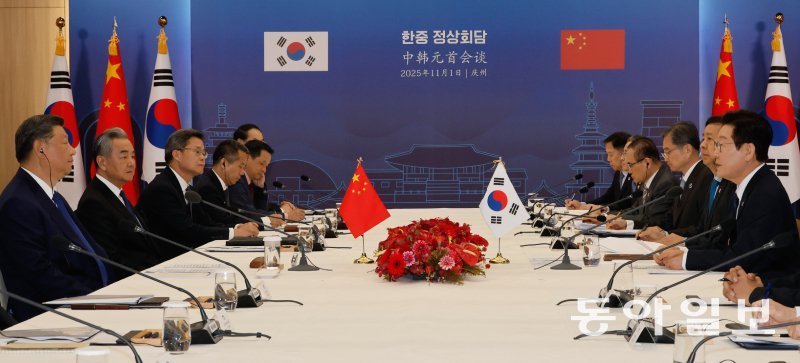 이재명 대통령과 시진핑 중국 국가주석이 1일 경북 경주 국립경주박물관에서 한중 정상회담을 하고 있다. 이날 시 주석은 회담 모두발언에서 “중한(한중)은 이사 갈 수 없는 중요하고 가까운 이웃이자 떼려야 뗄 수 없는 협력 동반자”라고 했고, 이 대통령은 “현재 한중 간 경제 협력 구조가 수직적 분업 구조에서 수평적인 협력 구조로 변화하고 있는 상황에서 양국 간의 호혜적인 구조로 더 발전해 나가야 한다”고 했다. 경주=송은석 기자 silverstone@donga.com