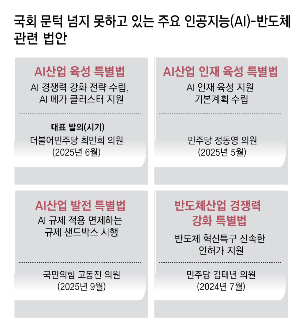 인공지능(AI) 및 반도체산업 육성을 위한 법안들이 여야 대치 속에 우선순위에서 밀리면서 속도를 내지 못하고 있는 것으로 나타났다.