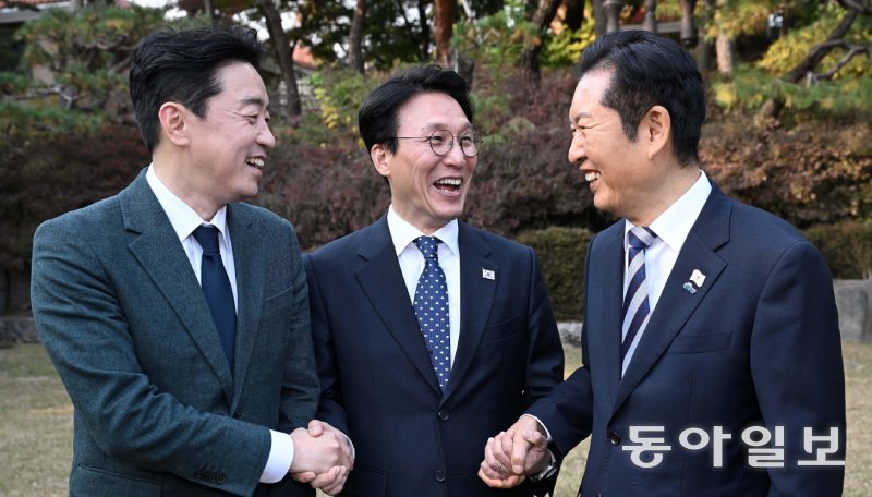 손 맞잡은 당정대 김민석 국무총리(가운데)와 더불어민주당 정청래 대표(오른쪽), 강훈식 대통령비서실장이 9일 서울 종로구 삼청동 총리공관에서 손을 맞잡은 채 대화를 나누고 있다. 민주당과 정부, 대통령실은 이날 고위당정협의회에서 2035년까지 온실가스를 2018년 대비 53∼61% 감축하기로 결정했다. 신원건 기자 laputa@donga.com