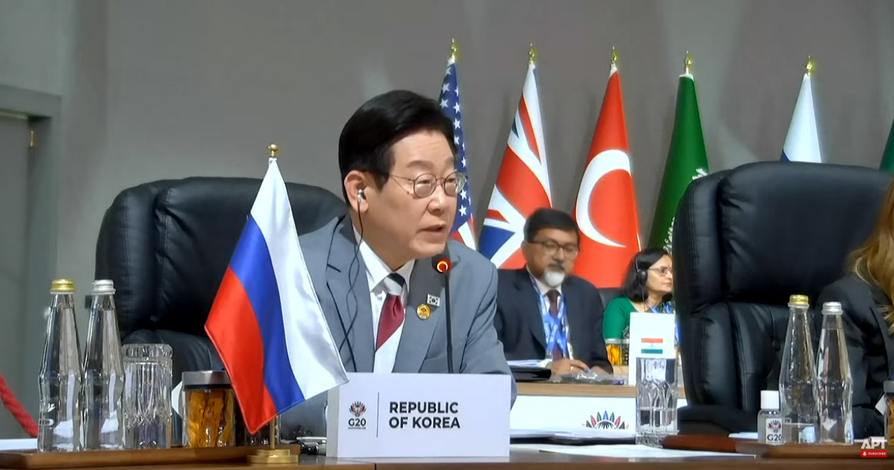 이재명 대통령이 22일(현지시간) 남아프리카공화국 요하네스버그에서 열린 주요 20개국(G20) 정상회의 세션1에서 발언하고 있다.   APT 유튜브 화면 캡처