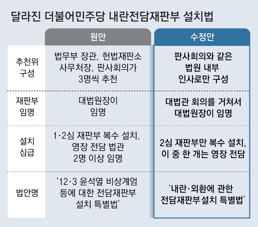 민주당은 법안명 역시 기존 ‘12·3 윤석열 비상계엄 등에 대한 전담재판부 설치 특별법’에서 ‘내란 및 외환에 관한 전담재판부 설치 특별법’으로 바꾸기로 했다. ‘12·3 윤석열 비상계엄’이란 표현을 제외한 것. 윤 전 대통령 등 특정 개인이나 사건을 겨냥해 만들어진 법은 헌법상 평등권을 침해해 위헌 소지가 있다는 지적을 고려한 것이다. 박 수석대변인은 “처분적 법률이라는 (문제)점을 제거하기 위한 것”이라고 설명했다.