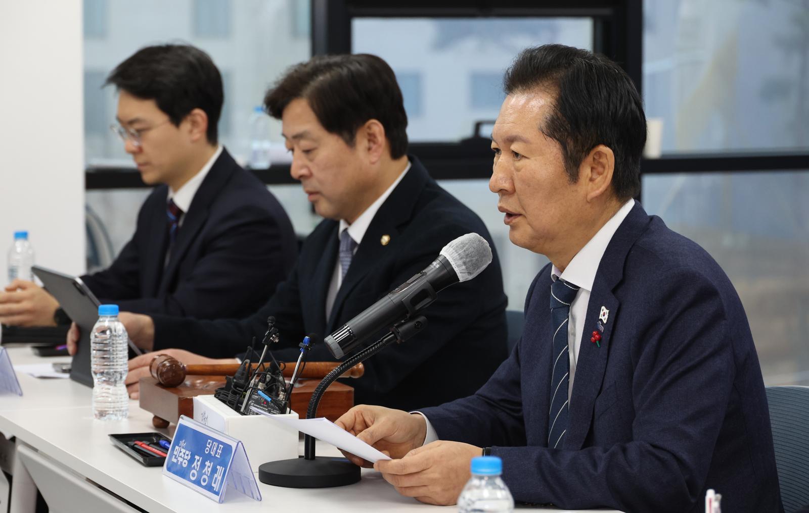더불어민주당 정청래 대표(오른쪽)가 17일 오전 강원 춘천시 민주당 강원도당에서 열린 현장 최고위원회의에서 발언하고 있다. 정 대표는 “정동영 통일부의 정책적 선택과 결정이 옳은 방향”이라며 “통일부 입장을 지지한다”고 밝혔다. 춘천=뉴시스