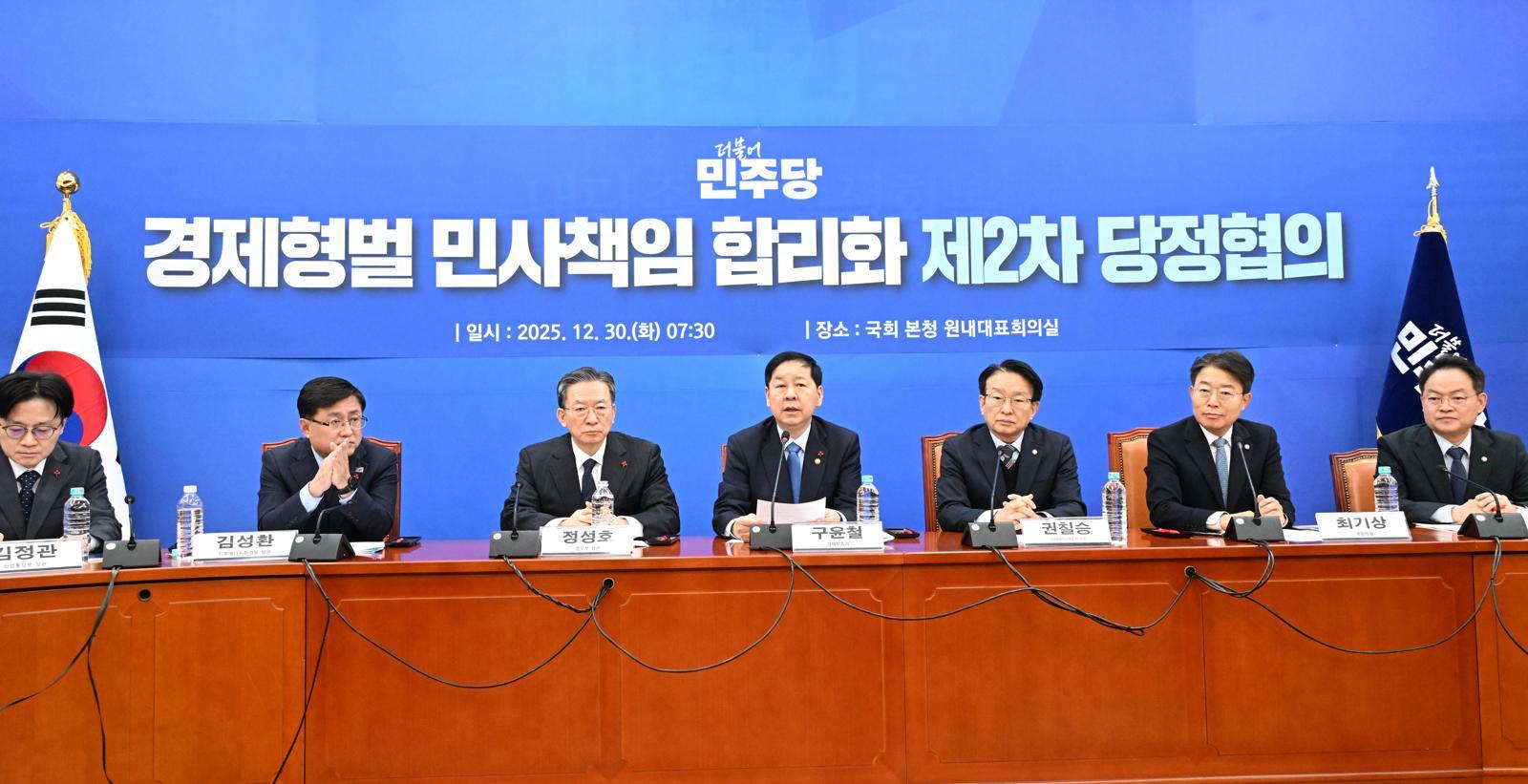 구윤철 경제부총리 겸 기획재정부 장관이 30일 서울 영등포구 국회에서 열린 ‘경제형벌 민사책임 합리화 제2차 당정협의’에 참석해 모두발언을 하고 있다. 2025.12.30 기획재정부 제공