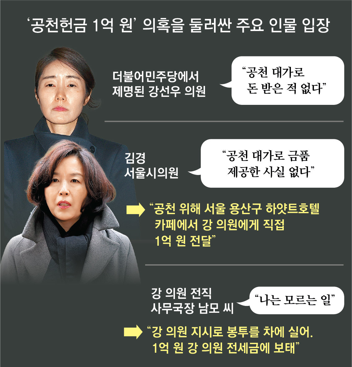 그러나 1억 원이 오간 자리에 함께 있었던 것으로 알려진 김 시의원과 강 의원의 전 사무국장 남 씨는 경찰 조사에서 금품 수수 전후 상황을 구체적으로 진술했다. 특히 남 씨는 “강 의원 지시로 (돈) 봉투를 차로 옮겨 담았다”며 “강 의원이 1억 원 헌금을 전셋집을 구하는 데 사용했다”고 진술한 것으로 알려졌다. 강 의원은 2022년 3월 서울 강서구 화곡동의 한 아파트 전세 계약을 맺으며 계약금으로 1억1000만 원을 대출 없이 지불했다. 이에 따라 경찰이 가까운 시일 내 강 의원의 신병 확보를 시도할 가능성도 제기된다.