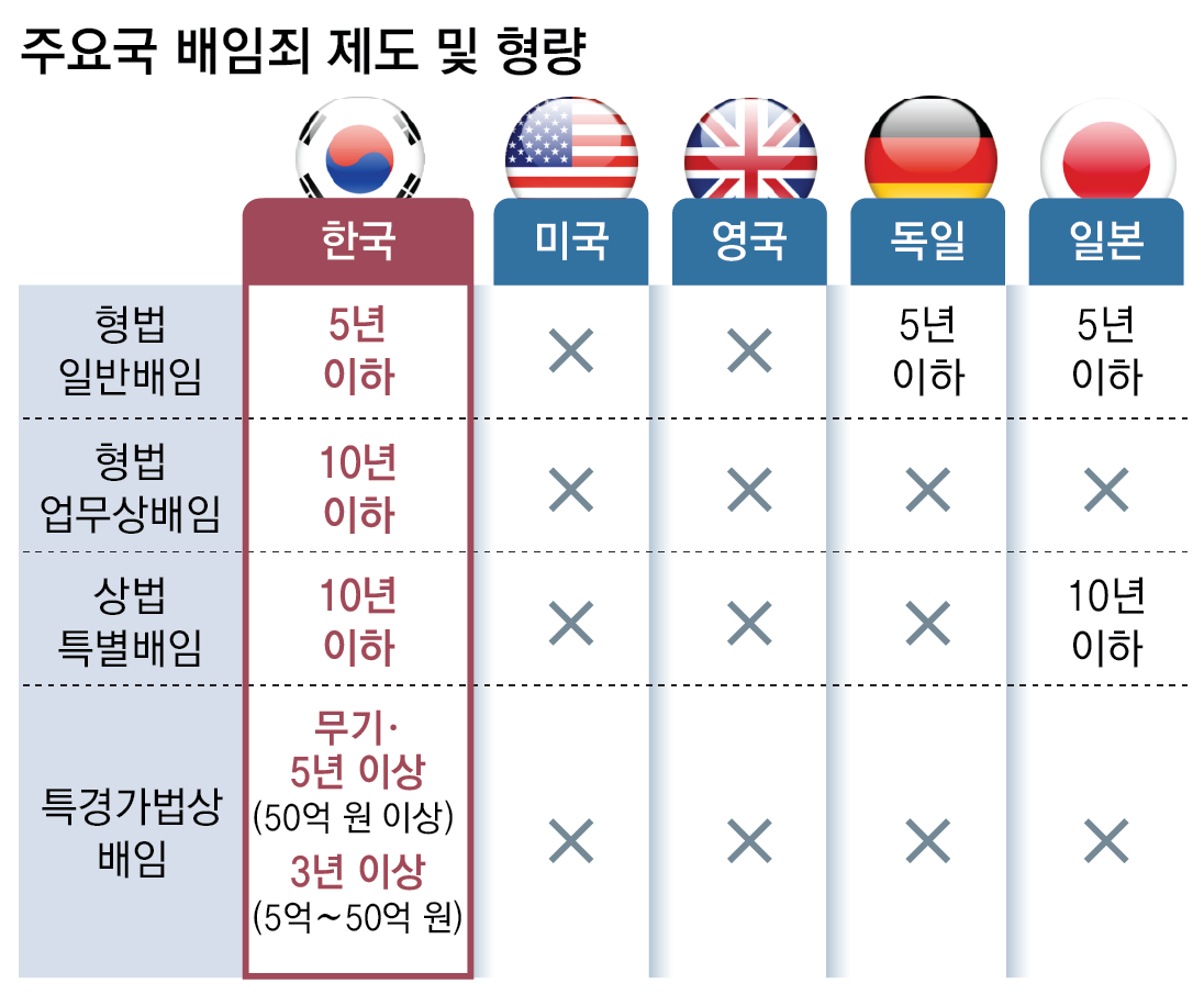 배임죄를 최초로 법전에 규정한 독일도 ‘경영판단 원칙’을 명문화해, 적절한 정보에 근거해 선의로 내린 결정이라면 손해가 발생하더라도 책임을 묻지 않는다. 일본은 배임죄를 두고 있지만, 고의성이 명확히 입증된 경우만 처벌한다. 한국경영자총협회에 따르면 최근 10년간 일본의 배임죄 기소 인원은 연평균 31명에 그친 반면에, 한국은 965명으로 31배에 달했다.