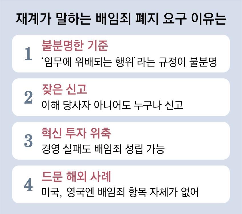 재계는 상법 개정안이 세 번째 개정을 앞둔 데다, 노란봉투법(노동조합 및 노동관계조정법 2·3조 개정안)이 통과되는 등 노동 친화 입법이 잇따르는 상황에서 기업 부담을 줄이는 배임죄 개편만 뒤로 밀리는 현 상황을 우려하고 있다. 이미 상법, 노봉법으로 사법 리스크가 커지고 있어 배임죄 리스크라도 줄여달라는 요구다. 미국발 관세 부담 등 외부 경영 리스크도 계속 커지고 있어 이제 더 이상 손놓고 있을 때가 아니라는 지적이다.
