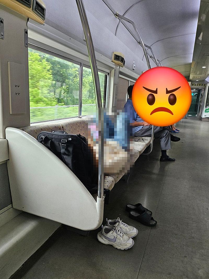 기차 좌석 위에 신발을 벗고 드러누운 무궁화호 승객의 사진이 온라인에 공개되며 시민의식 논란이 일고 있다. 열차 내 좌석 5칸을 차지한 모습에 누리꾼들은 “살림 차릴 기세”라며 공분을 드러냈다. 온라인 커뮤니티 보배드림 캡처사진에는 신발을 벗고 무궁화호 좌석 5칸을 가로지르며 드러누운 한 남성 승객의 모습이 담겨 있었다. 그는 가방을 베개 삼아 머리를 대고 누운 채 휴대전화를 보고 있는 모습이었다.