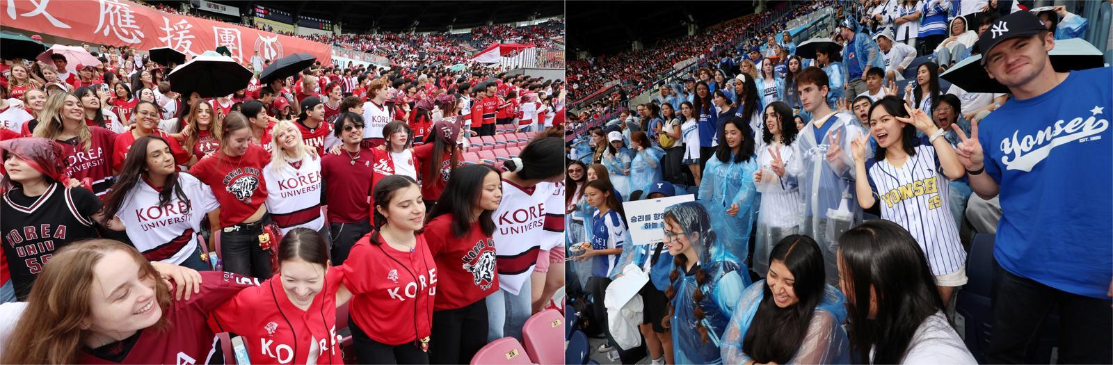 19일 서울 송파구 잠실야구장에서 열린 2025 정기 고려대학교·연세대학교 친선경기대회(고연전) 야구 경기에서 양 대학교 학생들이 응원전을 펼치고 있다. 양 대학은 매년 해당 대회의 명칭을 ‘고연전’과 ‘연고전’으로 번갈아 사용하고 있다. 올해는 연세대 주최로 개최되기에 ‘고연전’으로 열린다. 뉴시스둘째날인 20일 고양종합운동장에서 열린 럭비에선 고려대가 21 대 19로 연세대를 꺾으며 종합우승을 확정지었다. 마지막 종목이었던 축구에선 연세대가 2대 0으로 이겼지만 우승 여부에는 영향을 끼치지 못했다.