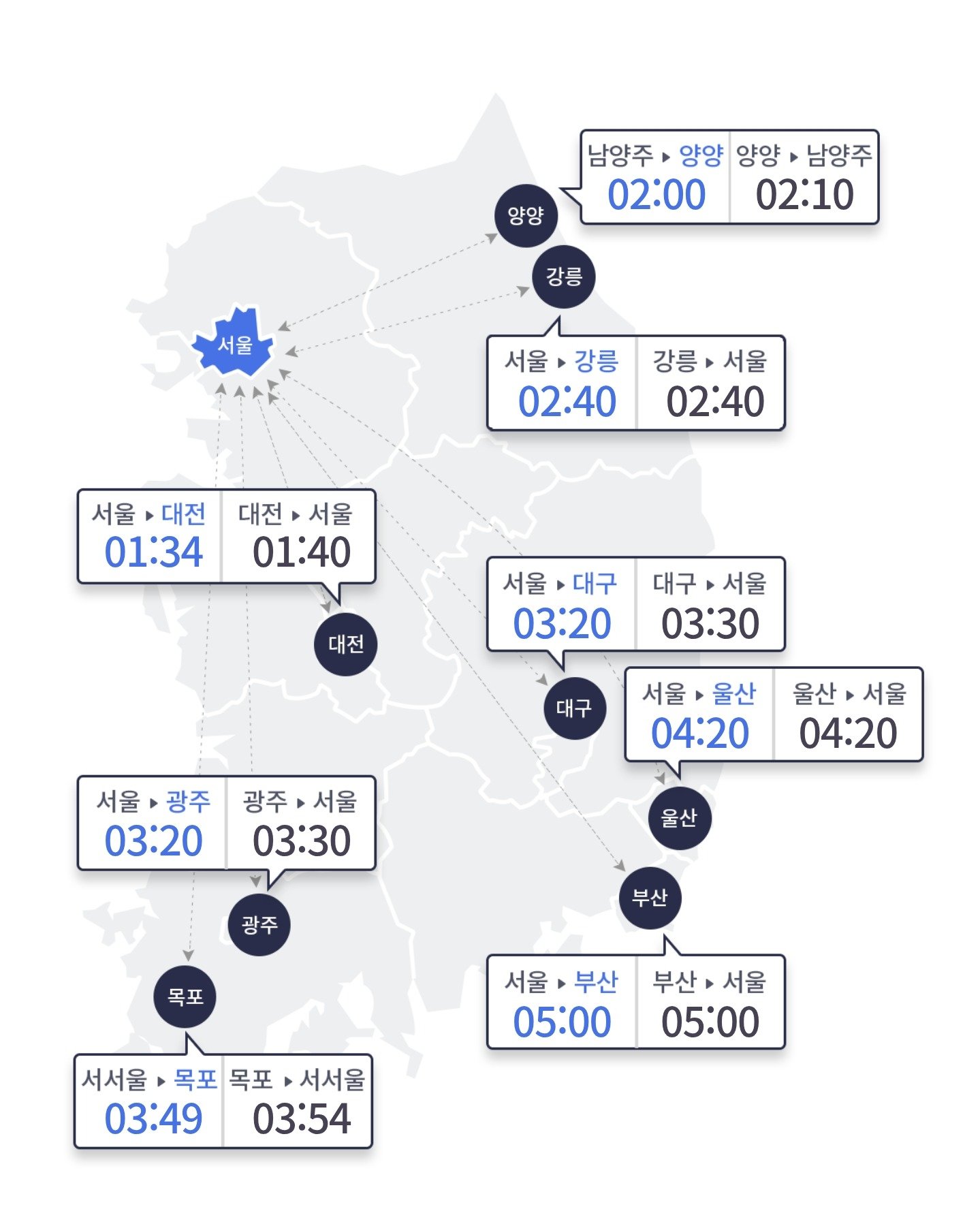 같은 기준 서울에서 지방 주요 도시까지의 예상 소요 시간은 △부산 5시간 △울산 4시간 20분 △강릉 2시간 40분 △양양 2시간(남양주 출발) △대전 1시간 34분 △광주 3시간 20분 △목포 3시간 49분(서서울 출발) △대구 3시간 20분이다.