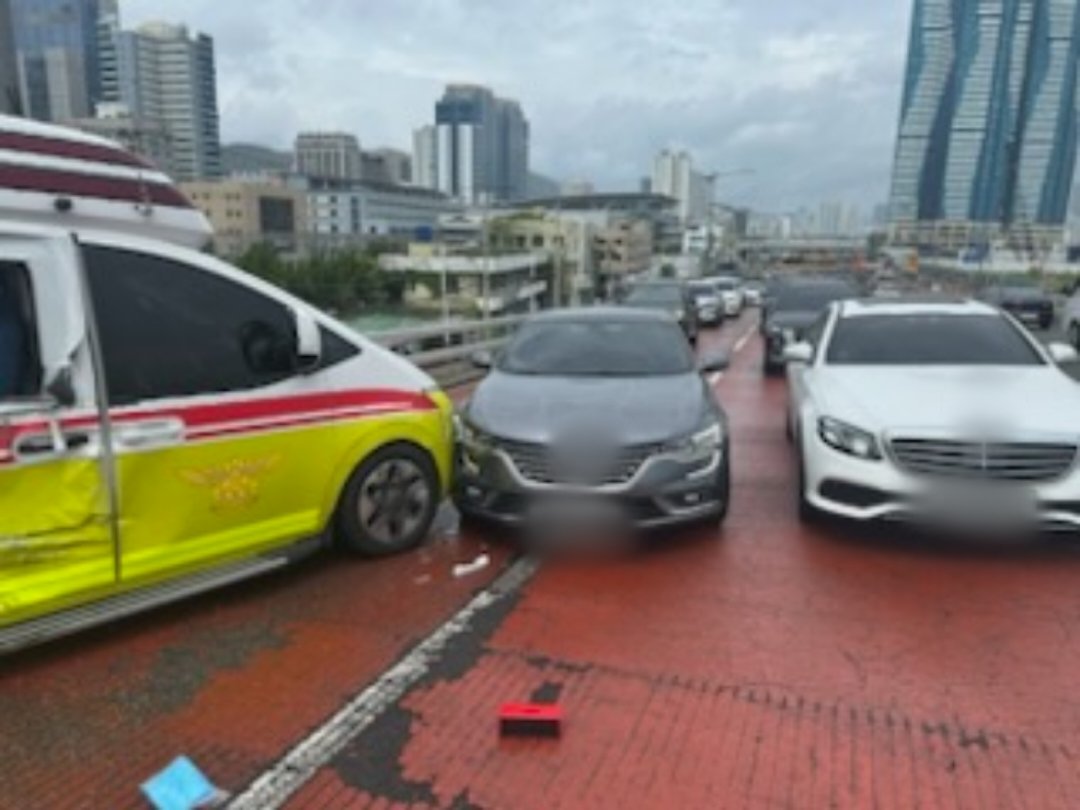20일 오후 1시 10분께 부산 중구 영주 고가교 부산역 방면에서 119 구급차가 빗길에 미끄러져 전방의 승용차를 추돌했다.