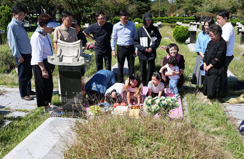 추석을 보름 앞둔 21일 인천 부평구 인천가족공원을 찾은 한 가족이 묘 앞에 차례상을 차려 두고 절을 올리고 있다.