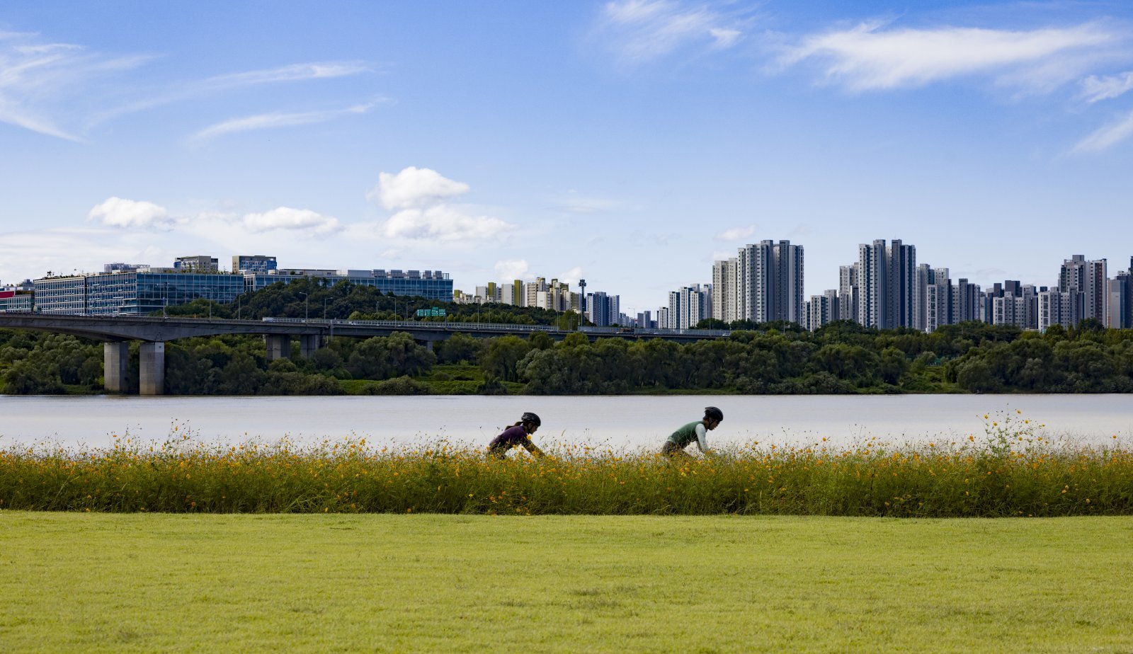완연한 가을 날씨를 보인 21일 경기 양주시 한강공원삼패지구 황화코스모스 밭 사이에서 시민들이 자전거를 타고 나들이를 즐기고 있다. 2025.09.21 [남양주=뉴시스]