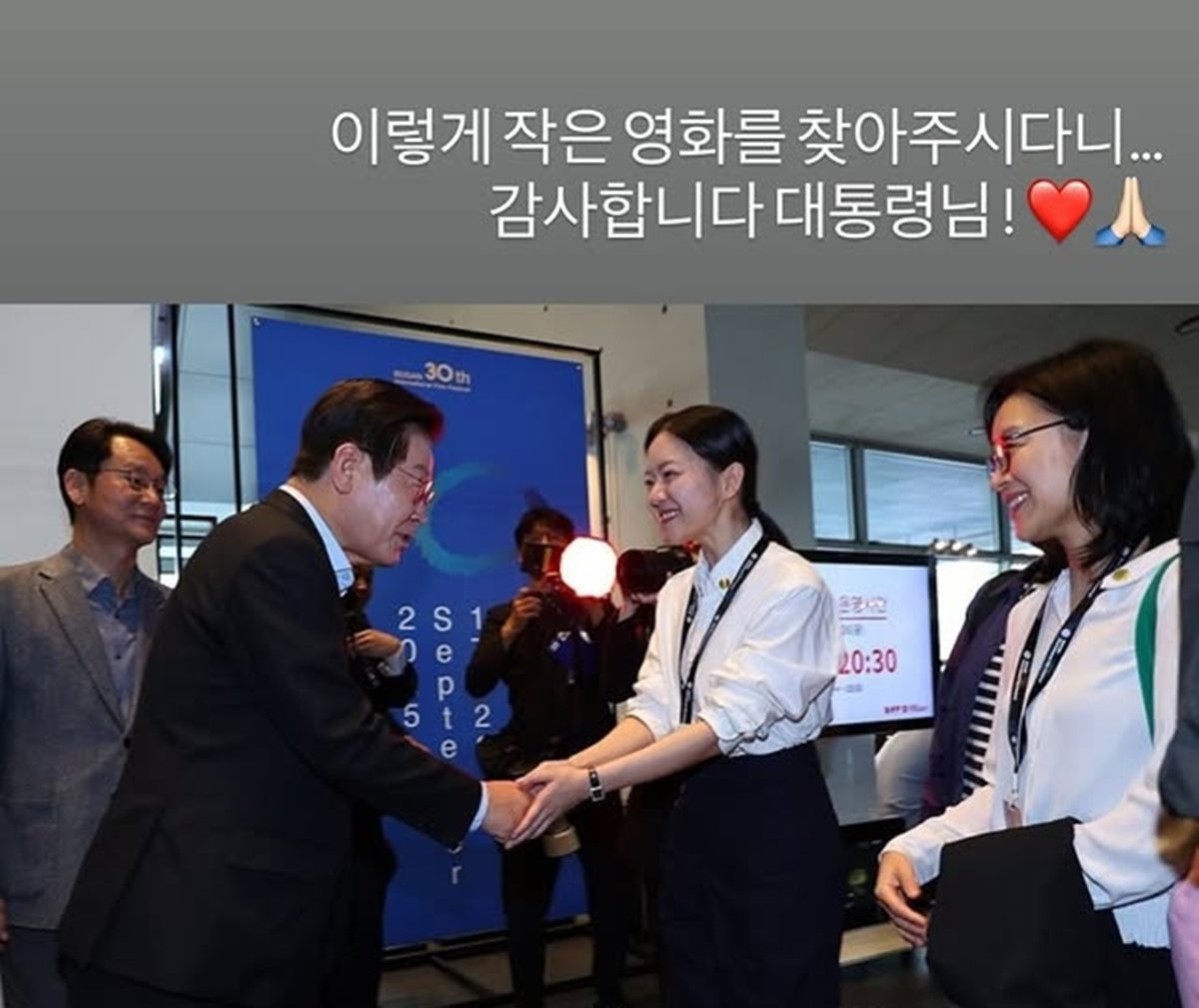 고아성은 20일 자신의 SNS에 “이렇게 작은 영화를 찾아주시다니…감사합니다 대통령님”이라는 글과 함께 이재명 대통령과 악수하는 사진을 올렸다. 빨간 하트와 두 손을 모은 이모티콘도 덧붙이며 진심을 표현했다.