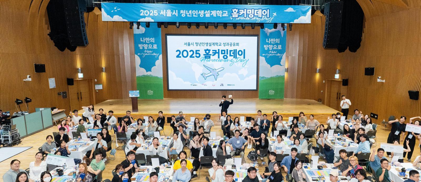 10일 서울 중구 시청 8층 다목적홀에서 열린 ‘청년인생설계학교 홈커밍데이’에서 수료생 100명이 밝게 웃으며 기념 촬영을 하고 있다. 이들은 이날 서로의 경험을 나누고 네트워킹하는 시간을 가졌다. 서울시 제공