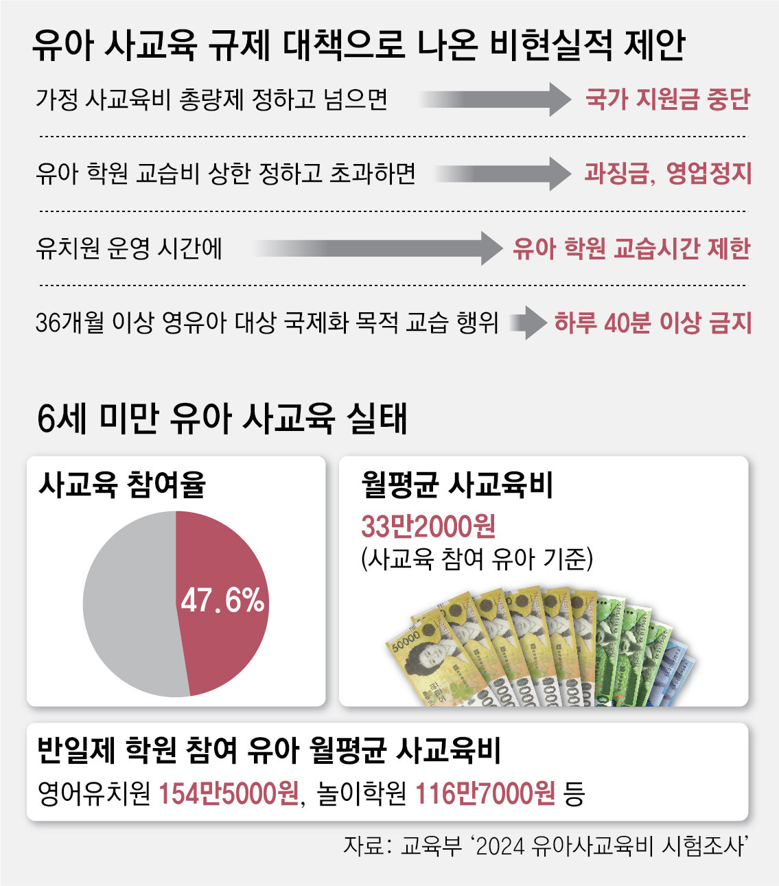 영유아 사교육을 규제하기 위해 ‘가정 사교육비 총량제’를 도입해 이를 초과해 사교육비를 지출하는 부모에게 육아 지원금을 끊거나, 유치원 운영 시간에는 학원을 운영하지 못하게 하자는 주장이 제기됐다. ‘4세 고시’, ‘7세 고시’ 등 과열된 영유아 사교육이 사회 문제로 떠오르자 각종 불이익을 주는 방식으로 규제하자는 취지다. 교육부가 실효성 있는 사교육비 대책을 내놓지 못하는 가운데 학부모 수요와 현장 상황을 고려하지 않은 규제 아이디어만 나오는 실정이다.