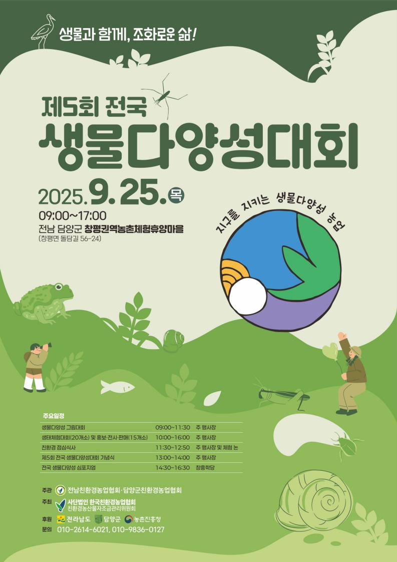 한국친환경농업협회와 친환경농산물자조금관리위원회가 주최하고 전남친환경농업협회, 담양군친환경농업협회가 주관하는 ‘제5회 생물다양성대회’가 오는 25일 전남 담양 창평 권역 농촌체험휴양마을에서 열린다.