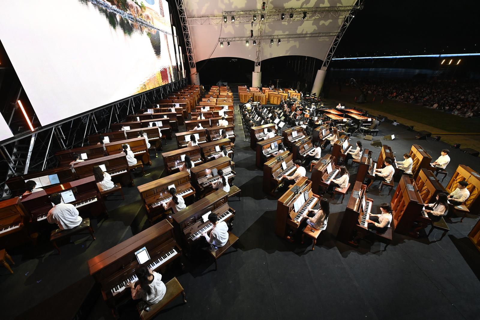 지난해 9월 대구 달성군 사문진 상설 야외공연장에서 열린 ‘달성 100대 피아노 공연’. 100명의 피아니스트가 100대의 피아노로 합주하는 장면이 장관을 이뤘다. 대구 달성군 제공