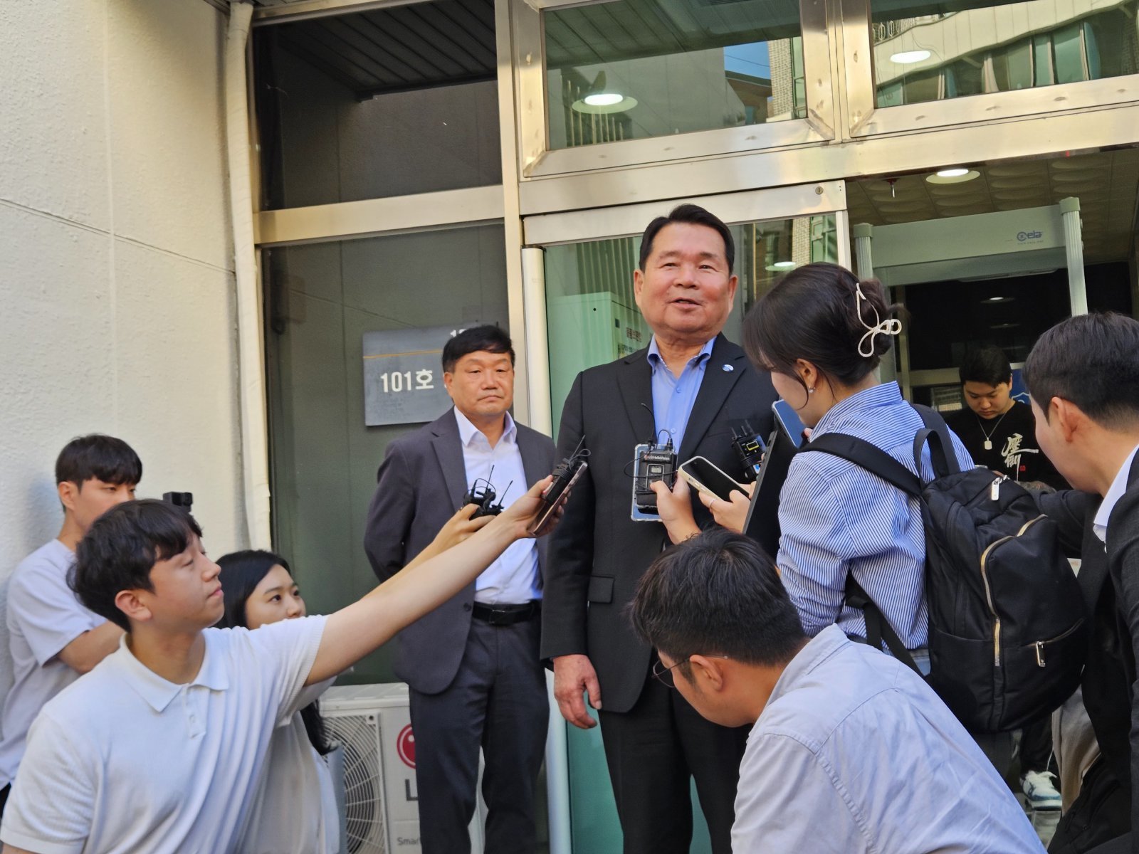 1심에서 징역형에 집행유예를 선고받은 신경호 강원도교육감이 23일 춘천지법 법정 앞에서 자신의 의견을 밝히고 있다. 뉴스1