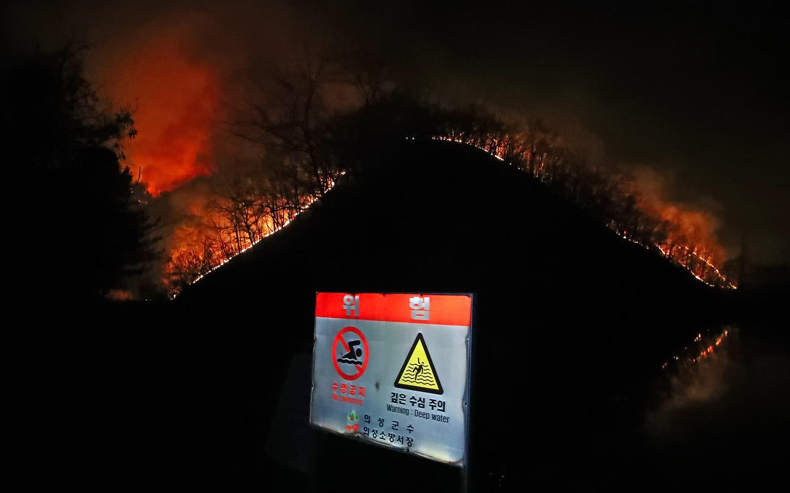 지난 3월23일 어둠이 짙게 깔린 경북 의성군 의성읍 업리 동사곡지 뒤 야산에 산불이 확산하고 있다. 2025.3.23/뉴스1