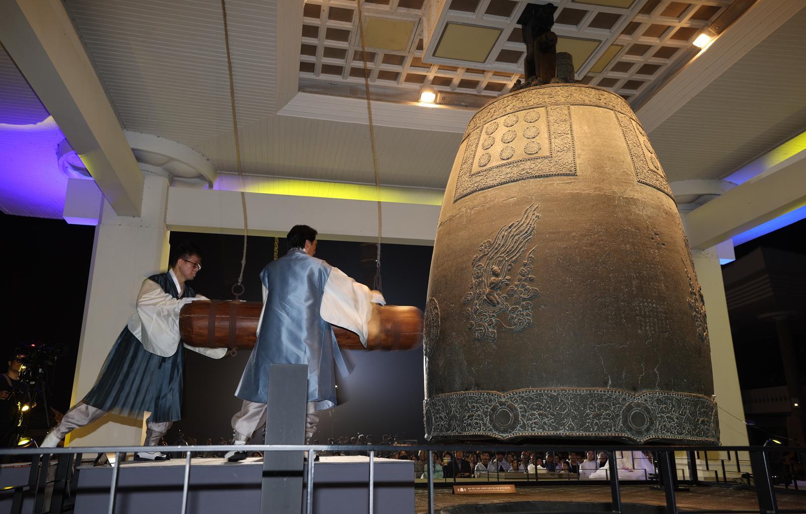 24일 경북 경주시 국립경주박물관에서 열린 ‘2025 성덕대왕신종 타음조사 공개회’에서 타종이 진행되고 있다. 에밀레종 이라는 별칭으로도 잘 알려진 성덕대왕신종은 우리나라에 남아 있는 가장 큰 종이자 최고 걸작으로 평가받고 있다. 22년 만에 일반에 공개된 이번 행사에는 사전 추첨을 통해 선정된 771명의 시민들이 참여했다. 771은 성덕대왕신종이 조성된 연도다. 2025.09.24. 경주=뉴시스