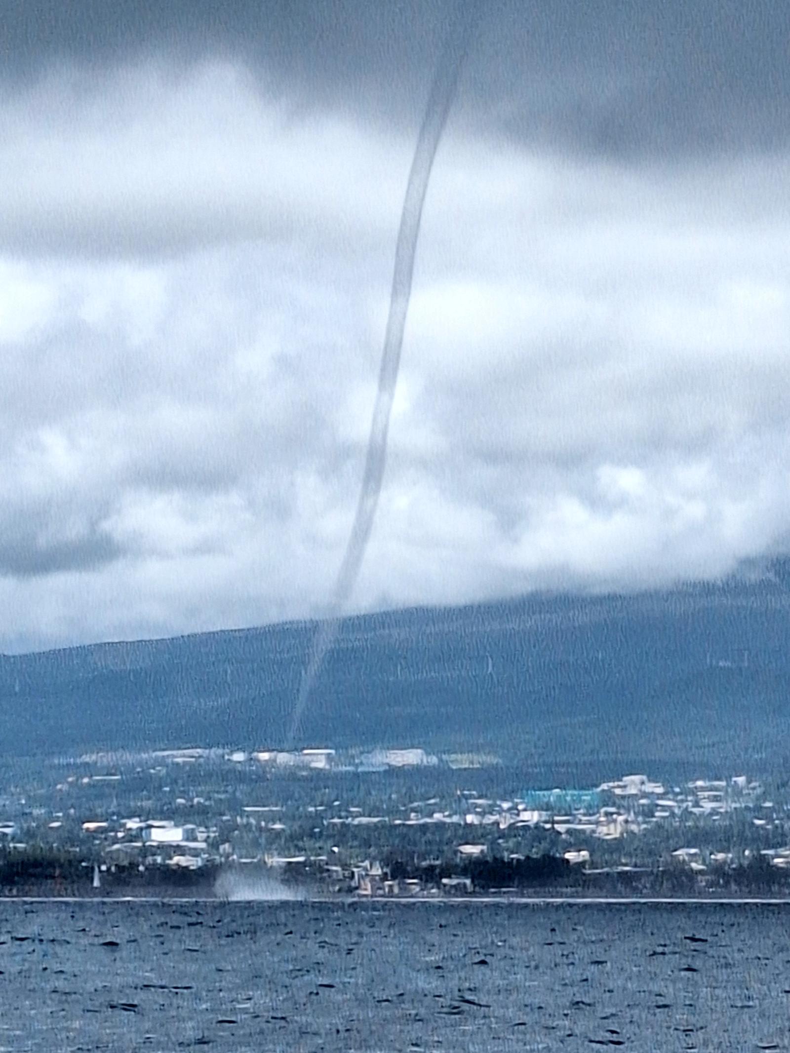 24일 오후 제주 서귀포시 하효동 해상에서 물기둥이 하늘로 솟아오르고 있다. 지표면 가까이에서 부는 바람과 높은 상공에서 부는 바람이 서로 방향이 달라 발생하는 기류 현상으로 용이 하늘로 올라가는 모습처럼 보인다고 해서 용오름으로 불린다. 이날 용오름은 10분 정도 지속되다 사라졌다.