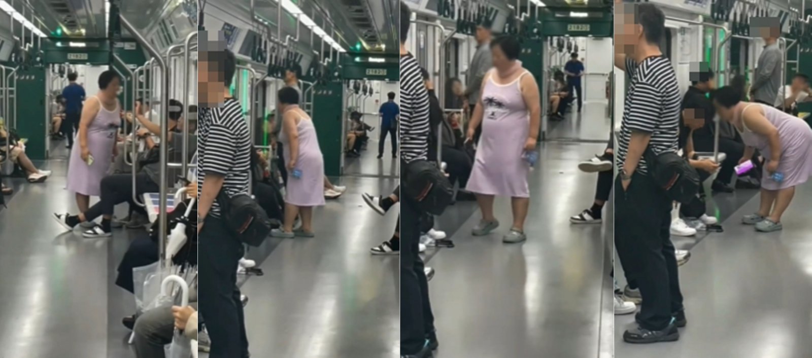 영상에서 연보라색 원피스를 입은 여성은 지하철 내부를 천천히 돌아다니며, 앉아 있는 남성 승객들 앞으로 다가가 껌으로 만든 풍선을 ‘펑’ 소리와 함께 터뜨리는 모습이 담겼다.