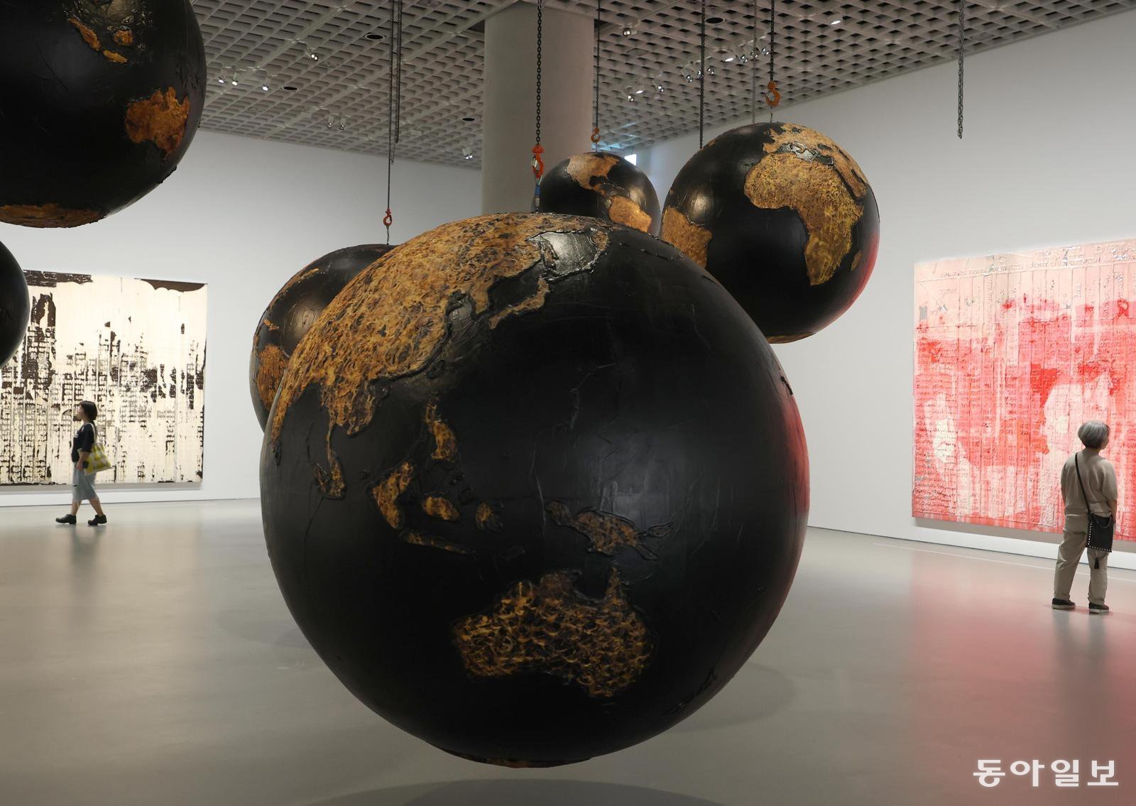 서울 용산구 아모레퍼시픽미술관에서 열린 미국 로스앤젤레스 출신 작가 마크 브래드퍼드 전시회에서 관람객들이 작품을 감상하고 있다. 도시에서 버려진 사물을 활용해 작품을 만드는 작업 방식으로 잘 알려진 작가의 이번 전시는 2026년 1월 25일까지 이어진다.