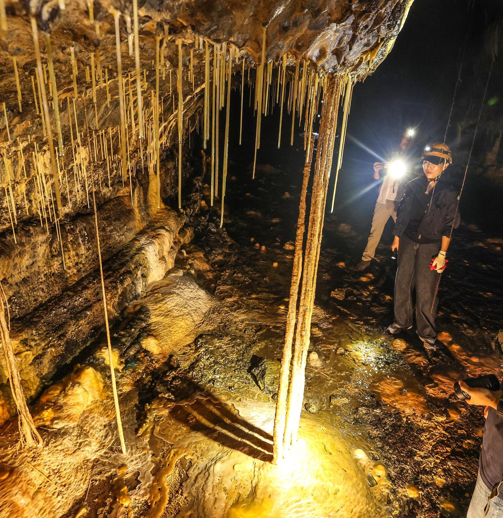 ‘2025 제주 국가유산 방문의 해’를 맞아 25일 특별 공개된 제주 제주시 구좌읍 월정리의 천연기념물 용천동굴 내부 모습. 약 30만∼10만 년 전 알칼리 감람석 현무암 용암으로 형성된 이 동굴은 종유석·동굴산호·동굴진주 등 다양한 2차 탄산염 생성물이 있어 학술적·경관적 가치가 높다.