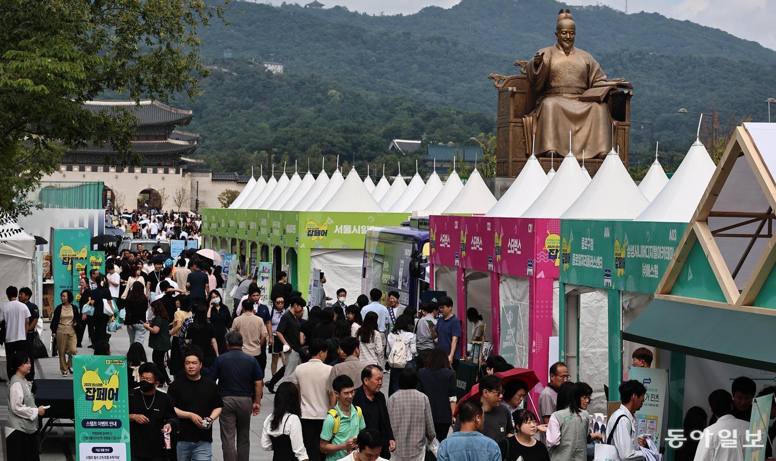 25일 서울 광화문광장이 ‘2025 리스타트 잡페어’ 행사장을 찾은 방문객들로 북적이고 있다. 기업, 은행, 공공기관 등이 차린 94개 일자리 부스와 인공지능(AI) 직무역량검사, 퍼스널 컬러 찾기 등 체험 부스에도 긴 줄이 늘어섰다. 양회성 기자 yohan@donga.com