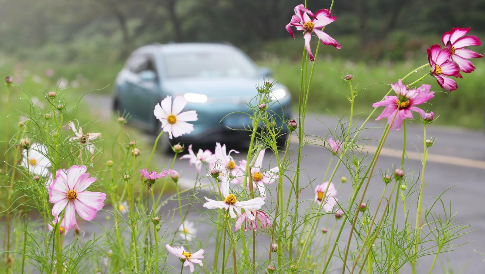 제주에 비가 내리는 10일 오전 서귀포시 표선면 가시리 녹산로에 코스모스가 펴 다가오는 가을을 알리고 있다. 2025.9.10/뉴스1