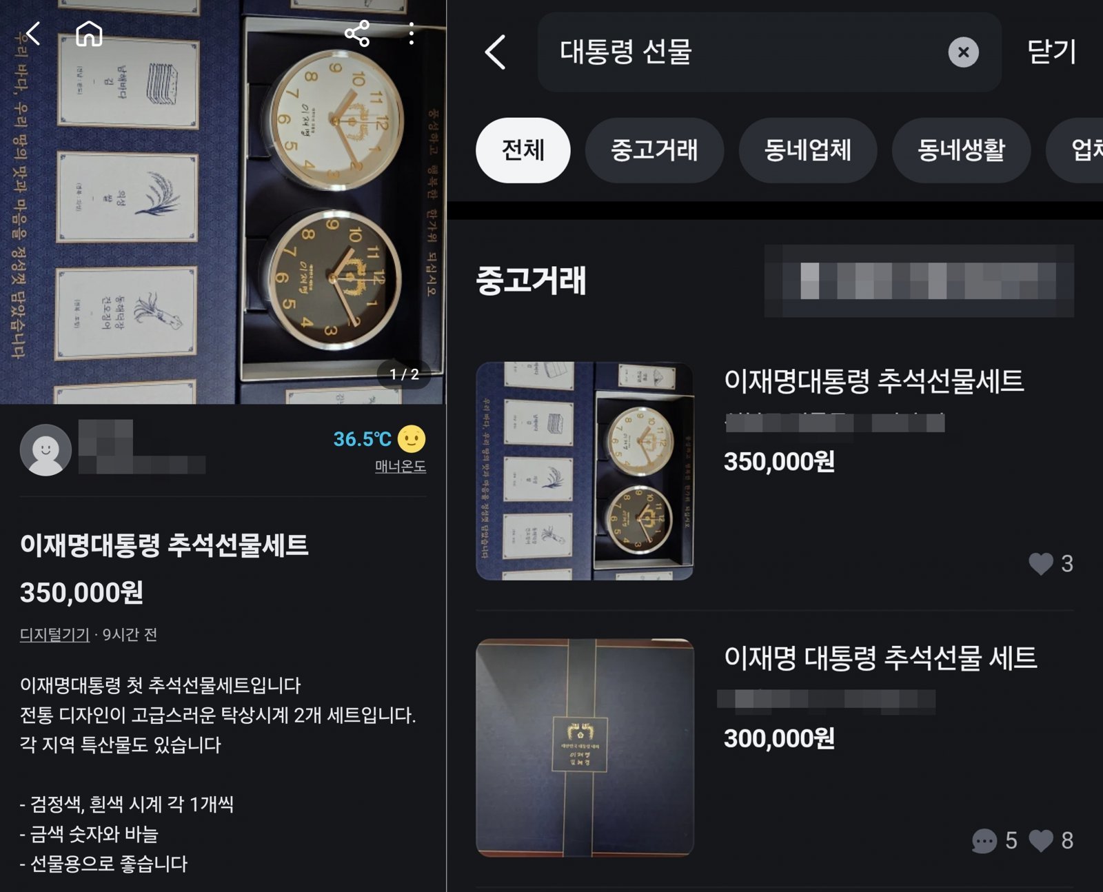 이 대통령의 선물이 공개된 지 이틀 만에 등장한 매물이다. 판매자는 “이재명 대통령의 첫 선물 세트다. 전통 디자인이 고급스러운 탁상시계 2개와 각 지역 특산물이 포함돼 있다”고 홍보했다.