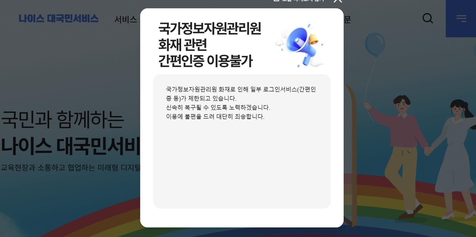 교육행정정보시스템 나이스(NEIS)는 17일 홈페이지에 “대전 국가정보자원관리원 화재로 인해 일부 로그인 서비스(간편인증 등)가 제한되고 있다”며 “신속히 복구될 수 있도록 노력하겠다. 이용에 불편을 드려 대단히 죄송하다”고 알렸다.