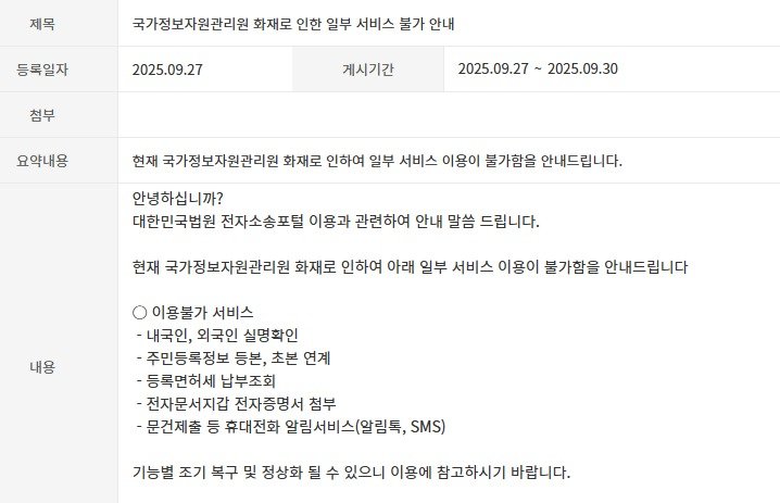 27일 법원 전자소송 포털과 인터넷등기소 홈페이지에는 각각 ‘국정자원 화재로 인한 일부 서비스 불가’ 안내문이 공지됐다.