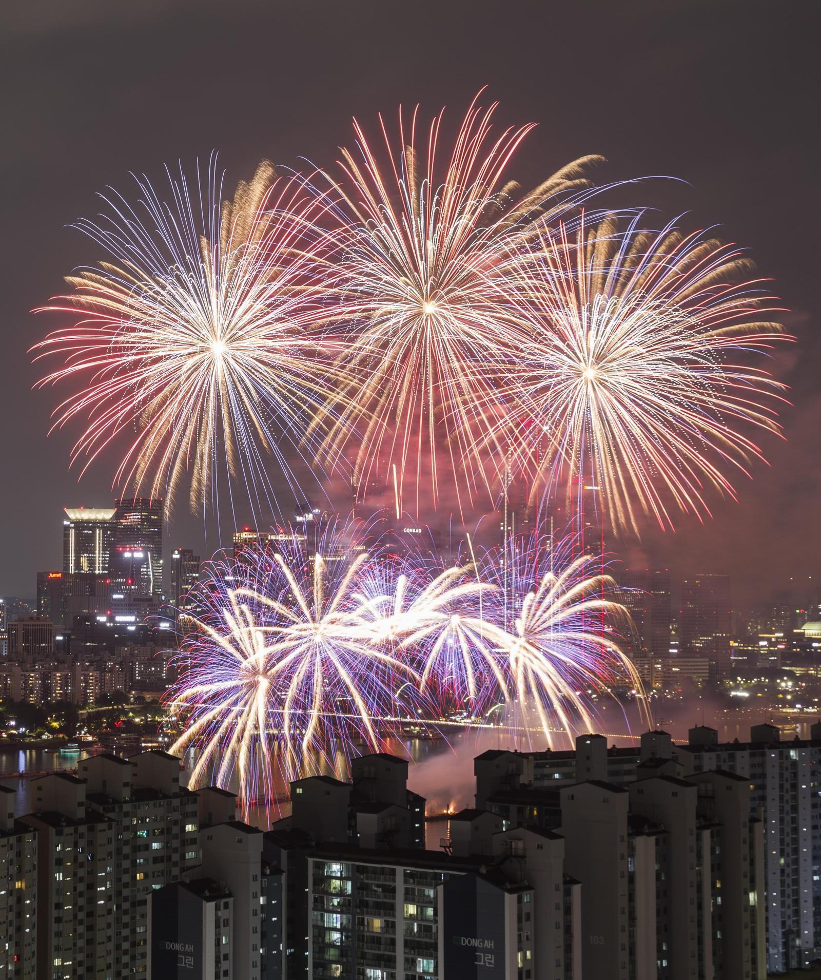 27일 오후 서울 여의도 한강공원 일원에서 열린 ‘2025 서울세계불꽃축제’에서 형형색색의 대형 불꽃이 한강 위 하늘을 수놓고 있다.