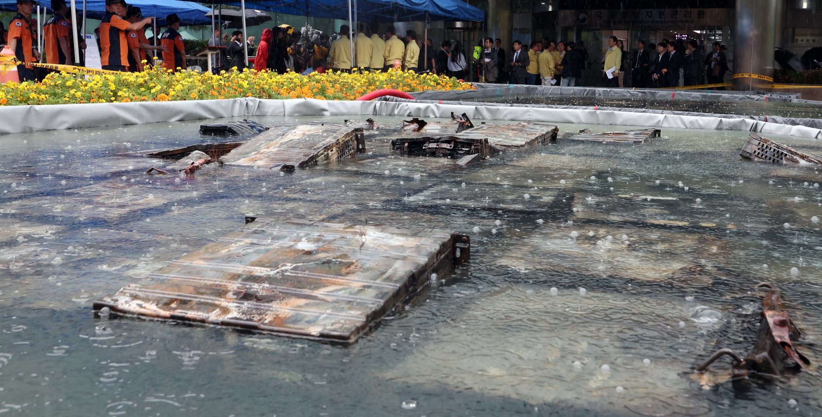 28일 화재가 완진된 대전 유성구 국가정보자원관리원. 외부 침수조에 냉각작업 중인 리튬이온 배터리 위로 빗방울이 떨어지고 있다. 2025.09.28. [대전=뉴시스]