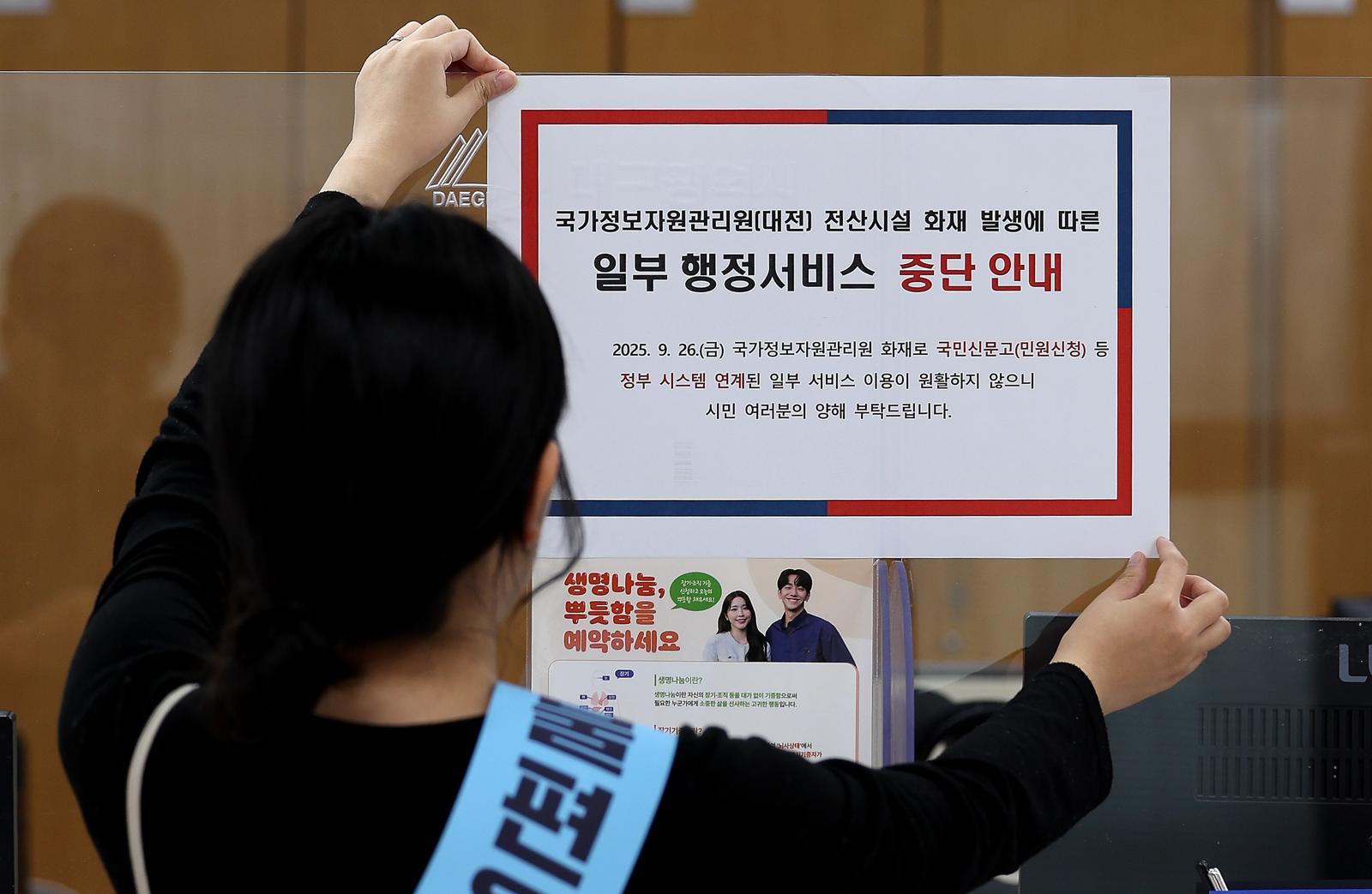 국가정보자원관리원(국정 자원) 전산실 화재로 온라인 복지 서비스, 정부24 등 주요 업무시스템이 중단된 29일 대구 중구 대구시청 동인청사 종합민원실에서 직원이 민원인 이용 불편 안내문을 부착하고 있다. 2025.09.29 뉴시스