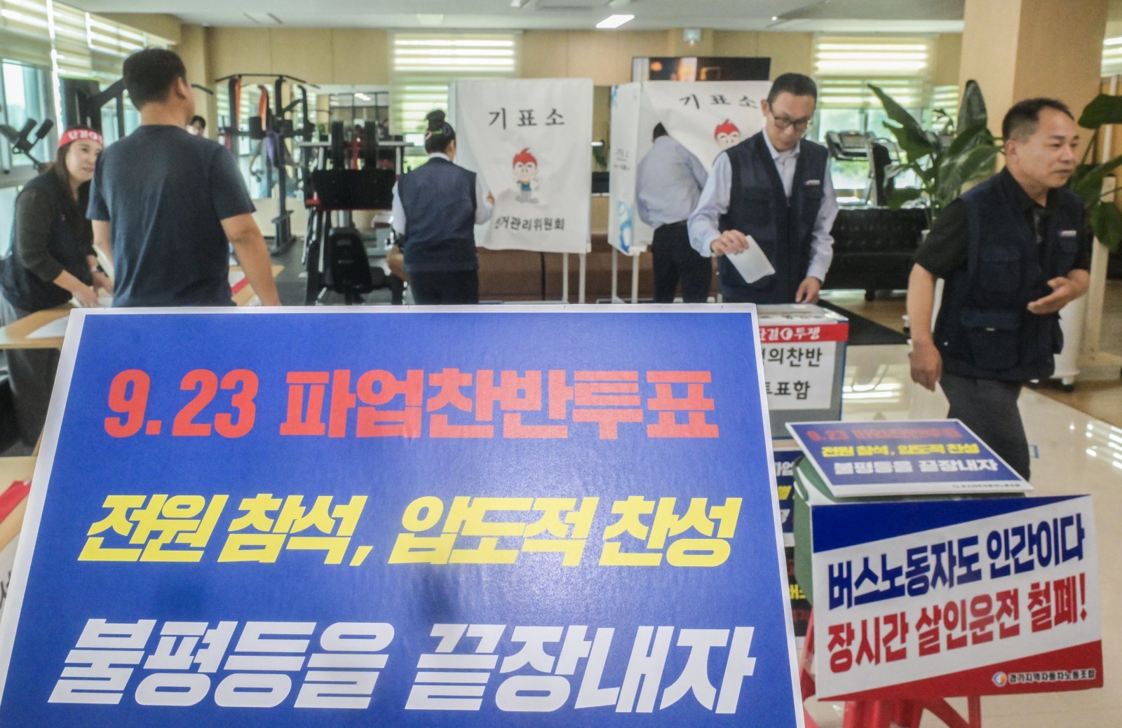 경기지역 47개 버스업체가 속한 경기지역자동차노조가 10월 1일 총파업을 예고한 가운데 23일 오전 경기 오산시 두곡동 오산시버스공영차고지에서 조합원들이 쟁의행위(파업) 여부에 대한 찬반투표를 하고 있다. (공동취재) 2025.9.23/뉴스1