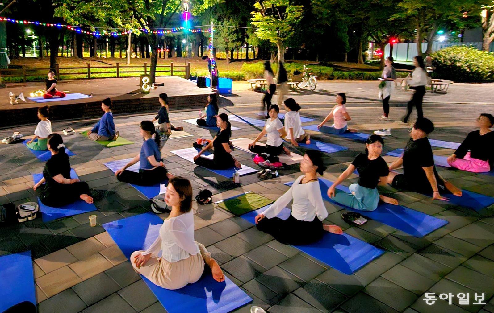 26일 시민들이 경기 부천시 부천중앙공원 원형 마당에서 열린 ‘부천 선셋 요가’ 프로그램에 참여해 야경을 배경으로 요가를 즐기고 있다. 부천 선셋 요가는 매주 금요일, 부천시청 잔디광장, 웹툰 융합센터 로비 등에서 11월 7일까지 진행된다. 참여 신청은 네이버 스마트스토어 ‘나들이 요가’를 통해 예약할 수 있다.