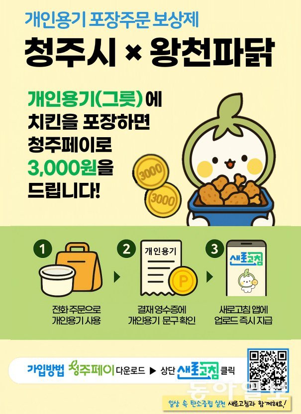 운영 방식은 간단하다. 치킨을 주문하려는 시민은 매장에 직접 전화해 개인 용기 사용 의사를 밝히면 된다. 업체는 개인이 가져온 용기에 음식을 담아 제공한다. 영수증에는 ‘개인 용기’ 문구가 인쇄되며, 이를 새로고침 앱에 업로드하면 지역화폐인 청주사랑상품권(청주페이) 3000원이 지급된다.