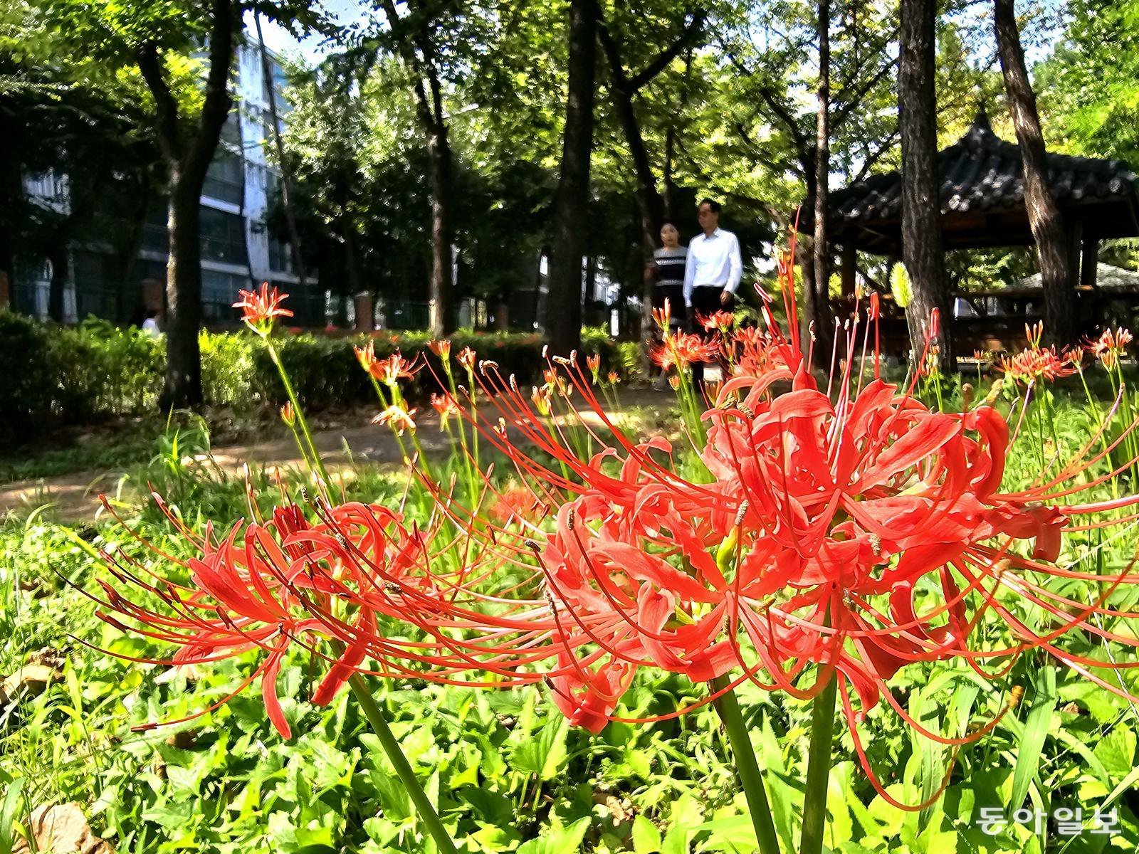지난달 26일 인천 연수구 용담공원 옆 연수벚꽃길에 ‘꽃무릇’이 활짝 피어 행인의 눈을 즐겁게 하고 있다. 꽃무릇은 상사화라고도 불리는데 꽃이 지고 나서 잎이 돋아나 꽃과 잎이 서로 만나지 못하는 특징이 있다. 9월 중순부터 10월 초순까지 핀다.