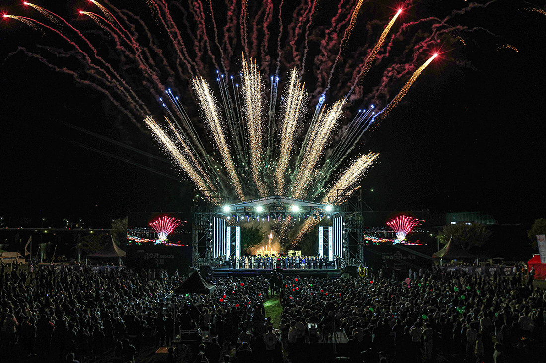 27일 대구 북구 산격대교 특설무대에서 열린 ‘금호강 바람소리길 축제’ 개막 행사에 불꽃이 터지고 있다. 행복북구문화재단 제공
