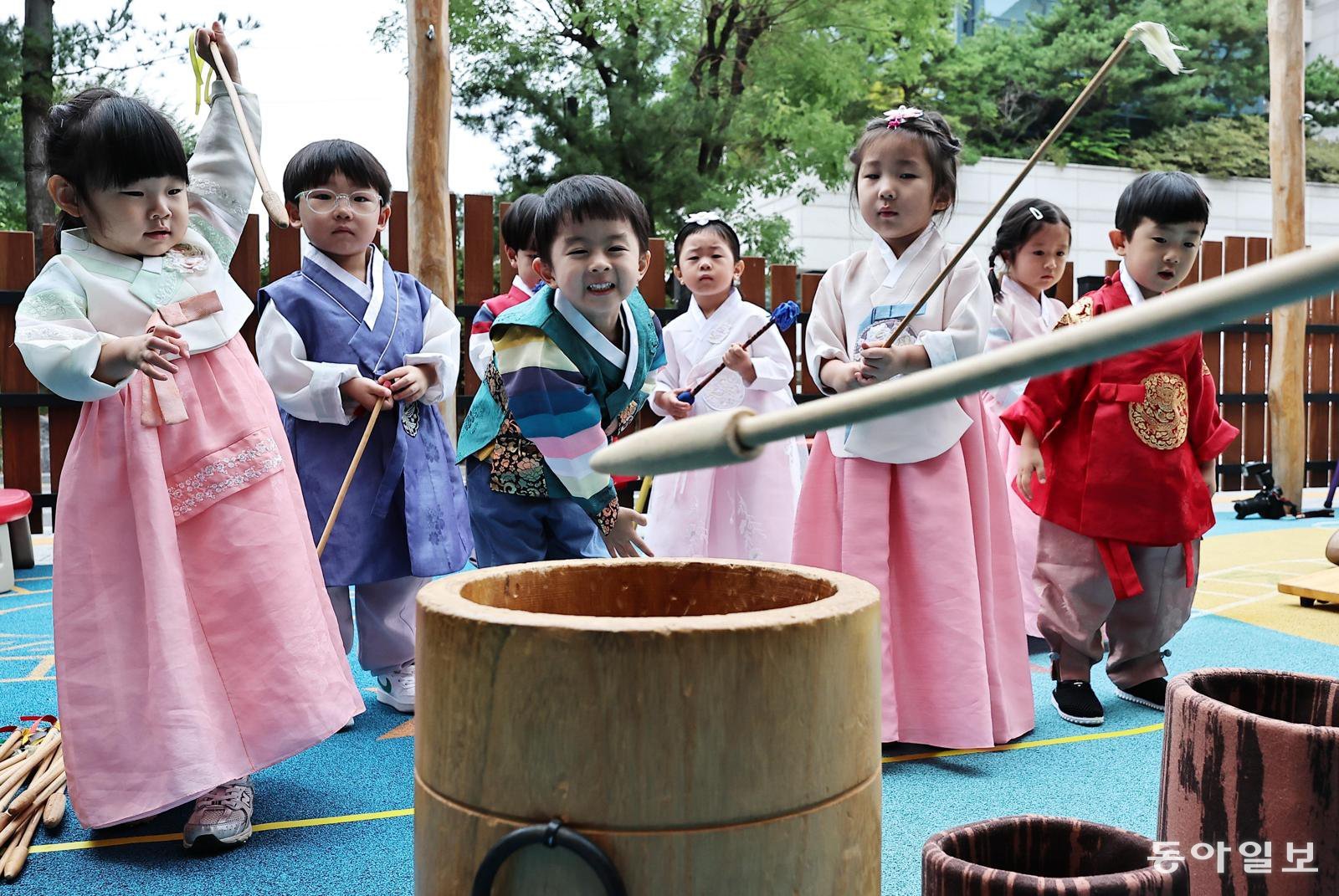 30일 오전 서울 노원구 노원구청직장어린이집 원아들이 추석을 맞아 한복을 입고 투호를 하며 즐거워하고 있다. 이날 어린이들은 널뛰기와 박 터뜨리기, 세배 배우기 등 전통놀이와 예절을 배웠다.
