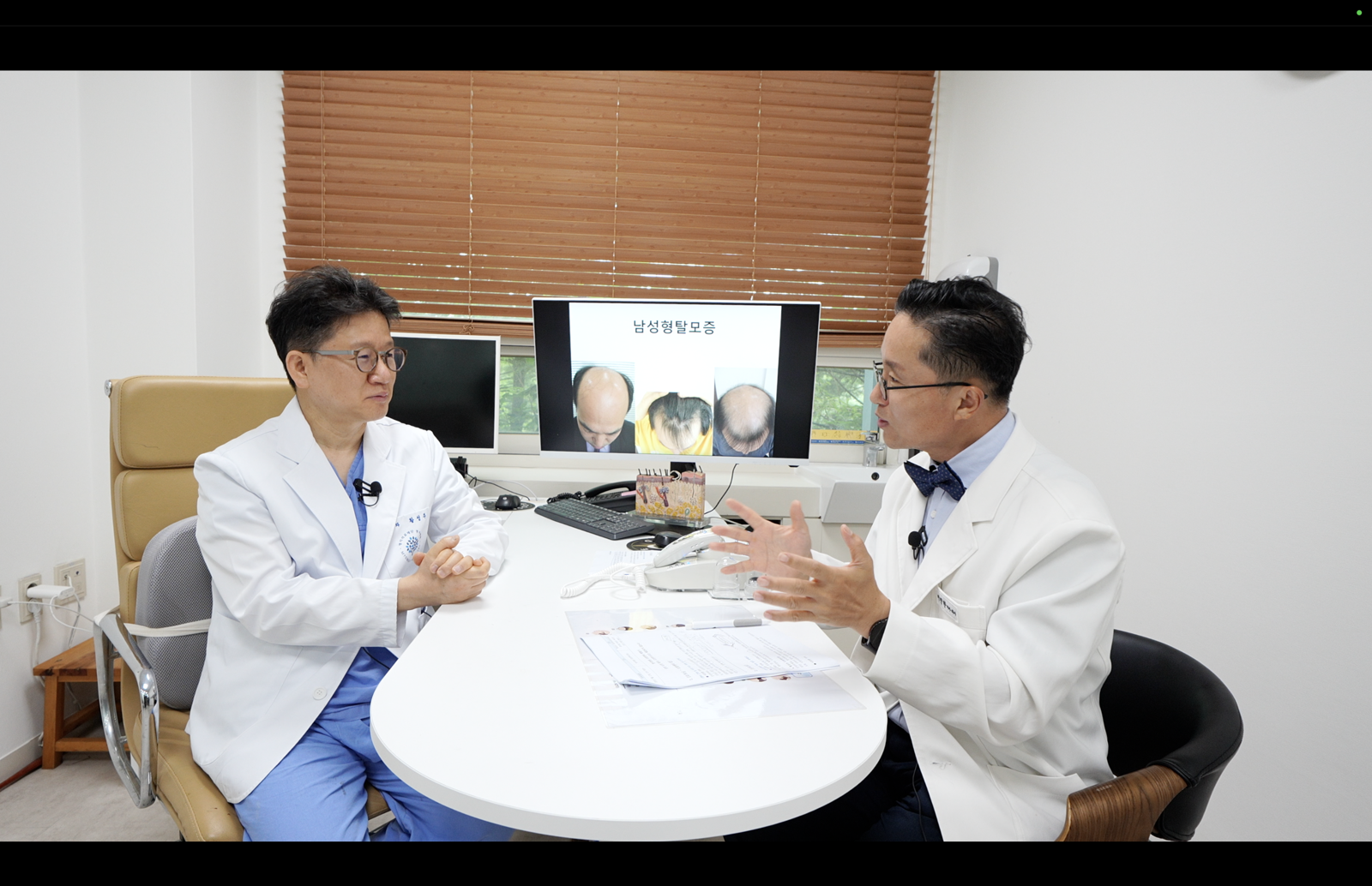 황성주 명지병원 모발센터장(왼쪽)과 탈모 치료 진단을 받은 이진한 본보 의학전문기자가 탈모 예방과 치료법에 대한 이야기를 나누고 있다. 이진한 의학전문기자·의사 likeday@donga.com