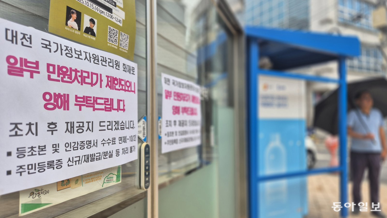 3일 서울의 한 주민센터 입구에 ‘국가정보자원관리원(국정자원) 화재로 일부 민원 처리가 제한된다’는 내용의 안내문이 붙어 있다. 화재 발생 8일째인 3일까지 국가 전산망 복구율은 17.8%에 머물렀다. 주민센터에서는 일부 민원 서비스를 제외한 대부분의 서비스가 복구돼 민원 처리가 가능하다. 양회성 기자 yohan@donga.com